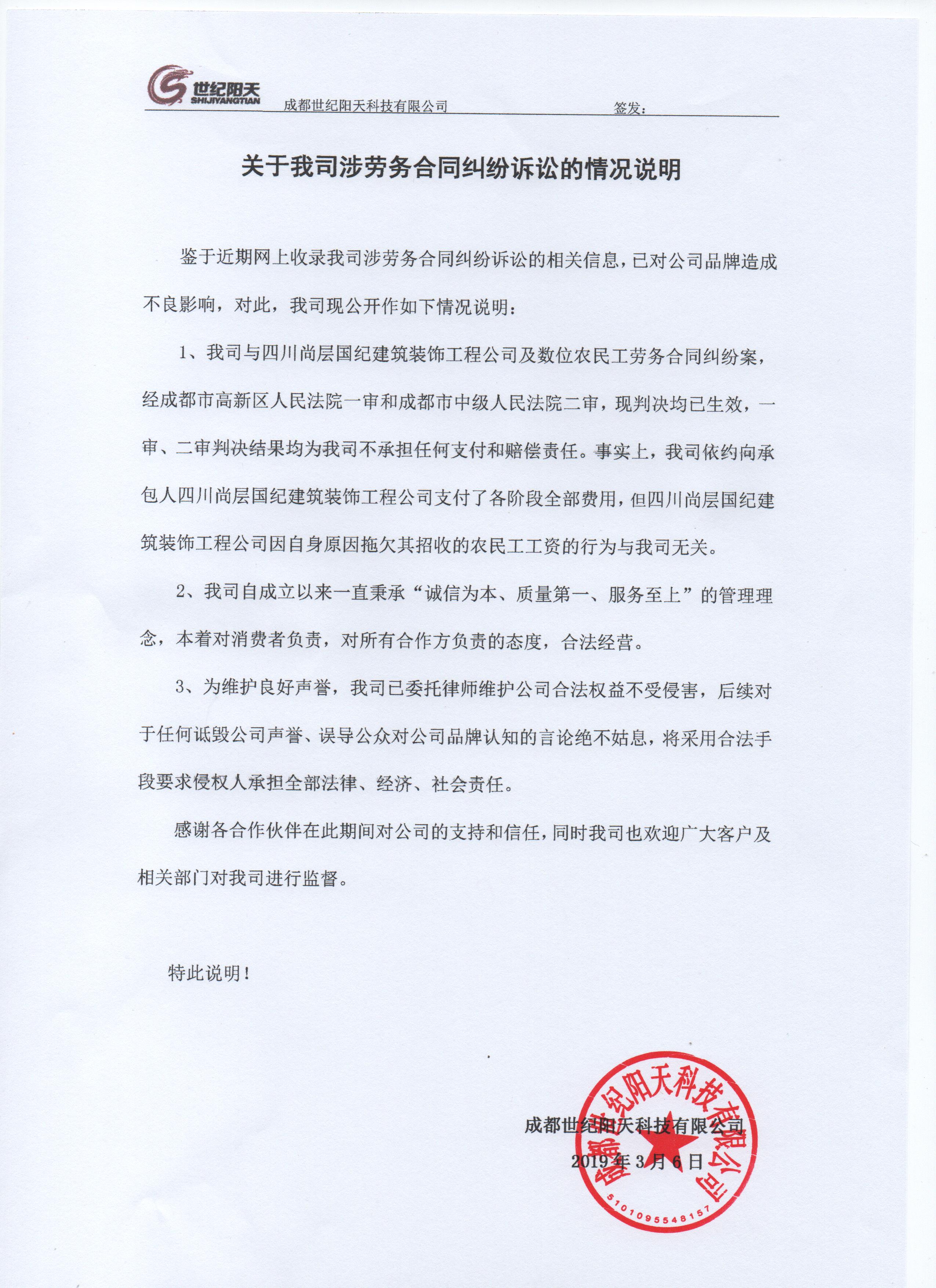 世纪阳天:关于我司涉劳务合同纠纷诉讼的情况说明